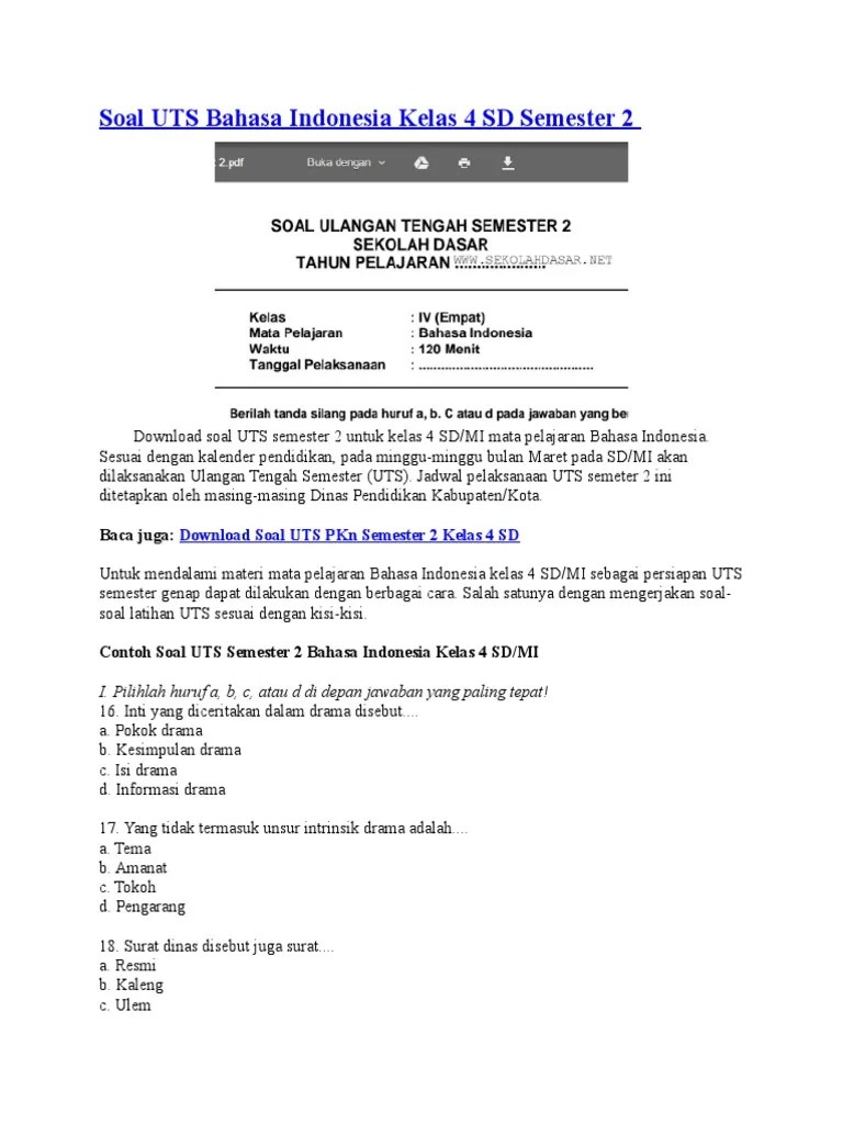 Contoh soal bahasa indonesia part 2. Bacalah teks berikut dengan seksama! Berikut tentang latihan soal dan kunci jawaban uts pts bahasa indonesia kelas 4 sd kurikulum 2013 semester 1 terbaru. Inilah pembahasan soal dan jawaban latihan uas, ukk dan pat untuk siswa kelas 4 sd / mi materi bahasa indonesia semester genap. Contoh soal uas bahasa indonesia kelas iv sd/mi lengkap dengan jawabannya. Incer latihan tematik jenjang : Warisan budaya indonesia yang sangat beragam perlu kita. Berilah tanda silang (x) pada huruf a, b, c, atau d untuk jawaban yang paling benar!